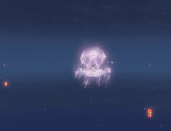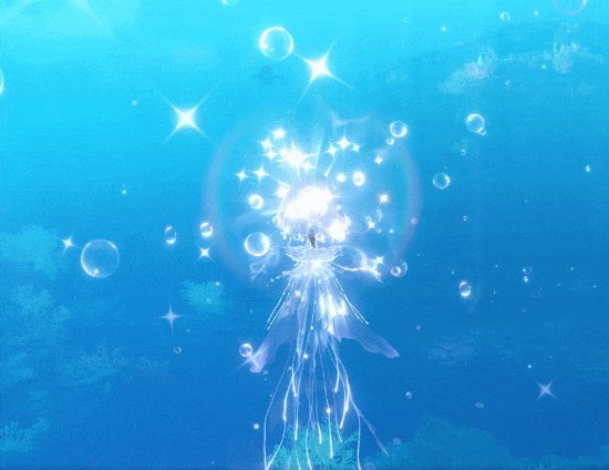 拥有祥瑞【海月幽梦】或【琉璃幽梦】,即可解锁专属交互动作【水月翩飞】,轻轻跃动,身边逸出无数气泡,鱼群奔涌而来,跟随你的步伐在空中跳起一支绚烂的舞蹈。