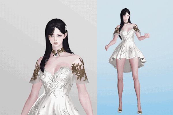 【命定契约礼装外观】的女款为礼服款式,淡雅的白色花朵发饰,颈部华丽的蓝宝石,裙上点缀的暗纹,让整套外观更加柔美,端庄中即雍容又清新。