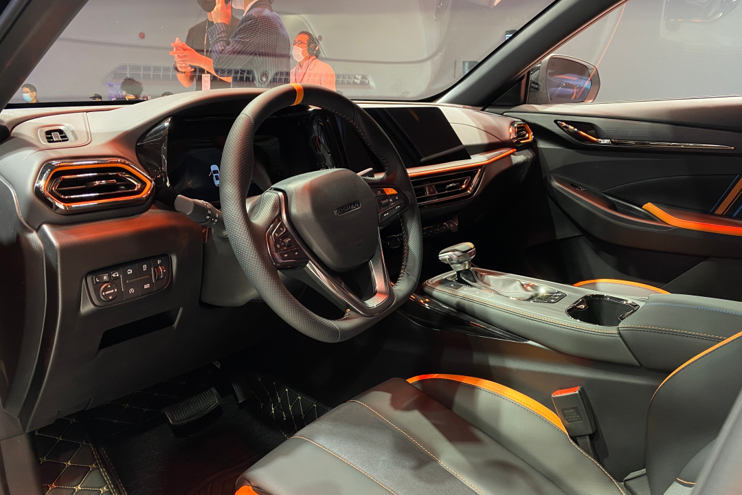 车内配备了专属运动方向盘、曜黑运动车顶、一体式赛车座椅,并辅之以橙色点缀,视觉效果非常拉风。
