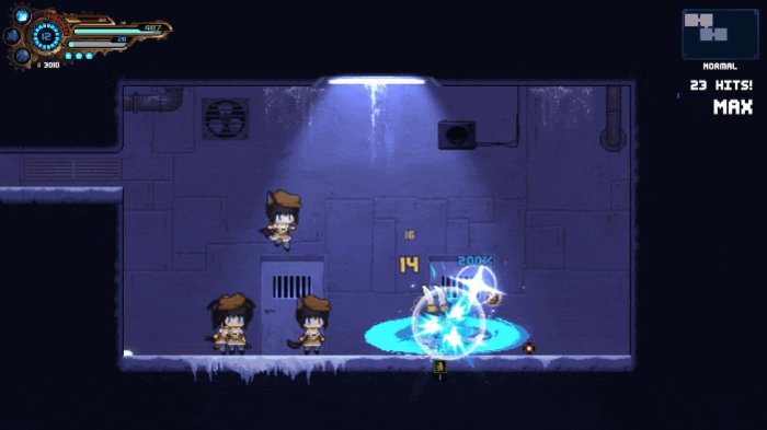 最初,你的攻击手段可能只有一套基础的小刀近身连击,以及用浮游炮射出的远程激光弹。但就像所有的银河城游戏一样,当你对这个世界探索得越多,你也会获得更多的新连招、新能力。