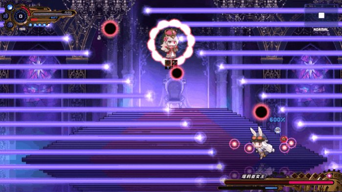 或许是为了让玩家能有更多机会和BOSS贴身肉搏,《TEVI》的弹幕密度,整体来说要比起《Rabi-Ribi》变得稀疏了很多。如果你选择了普通难度的话,那么可能要到游戏中期,你才会感受到一些来自BOSS的弹幕压力。