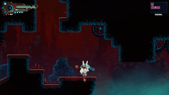 或许这种套路用上一两次还好,但要是游戏里为数不多的主要场景全都采用了这种模式,就只能让人感到有些没活硬整了。它让本该依靠新意来打动玩家的银河城关卡,最后都变成了单调的重复劳动,可能在通关之后,你只能记得《TEVI》关卡中那些伤害高到离谱的倒刺和杀人机关,而很难从其中挑出什么具有创造力的设计。