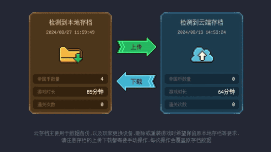 除了新手友好的设计和双人线上联机,《挺进地牢》手游新增了云存档功能,支持云存档的手动上传和下载。之前参与过测试的玩家若上传过本地存档,可尝试在正式版本将云存档下载至本地读取进度。