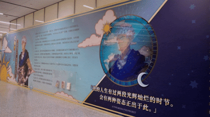 来到展区内,一场神奇的古文明探寻之旅便正式展开。一条长卷在墙面展开,分别展示出年轻与老年托勒密的形象,同时介绍托勒密的生平。中央的光栅画随着读者的移动,不断切换青、老年托勒密形象,带领参观者更好的理解这位历史人物的多面。