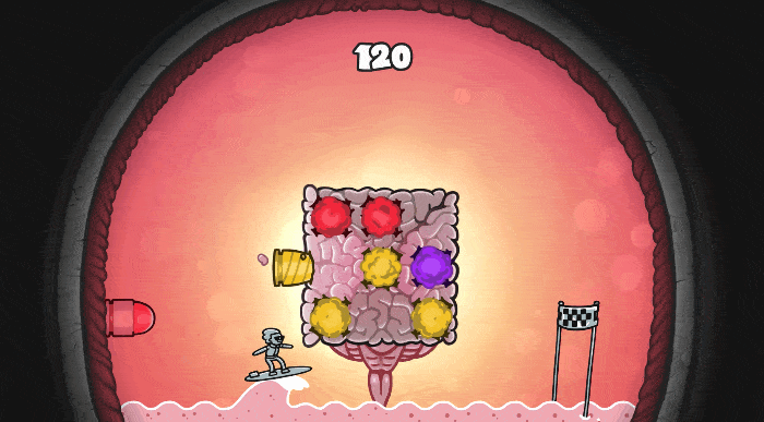 心灵冲浪会让你进入一个类似三消玩法的小游戏模式。屏幕边缘会不断从三个方向射出各种颜色的子弹击打在中央方块上,而你要做的就是通过鼠标左右键来旋转方块,调整子弹的落点,尽可能让三个同样颜色的子弹连成一线消失,来获取更多的时间奖励,从而支撑画面下方的小人缓缓冲浪抵达终点。