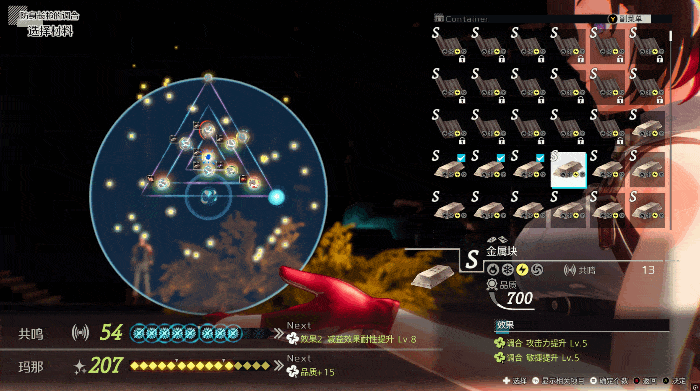 本作采用了与莱莎相似的材料环设计,只不过重点并非在于解锁分支,而是通过不同材料的共鸣范围,覆盖到更多的节点,从而获得更多的共鸣点数与玛娜点数,来提高道具的质量与属性。