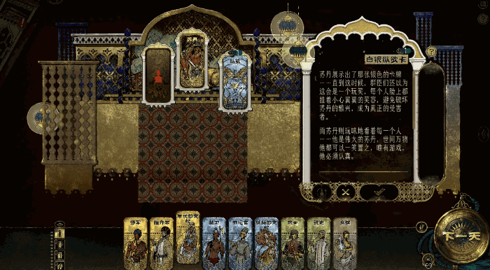 而“苏丹卡”在这套规则中的地位自然也是至高无上的。初次进入时,游戏会以苏丹的视角进行一次简单的教学,让玩家了解“苏丹卡”的运作机制。简单点说就是玩家需要抽取一张“苏丹牌”,完成牌面要求的“纵欲”“杀戮”“奢靡”或“征服”任务,这些任务没有规则限制,只有目标导向——你可以用任何手段满足要求而完全不用担心其后果,哪怕代价是颠倒黑白甚至是无视道德伦常。