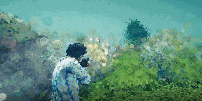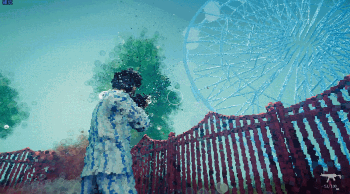 在主角的梦境中,整个世界就像是从色彩堆成的海洋,并且它是流动的。游戏中的所有场景和物体都由各种颜色的粒子堆砌而成,可抽象也可具体。前者就像是一团团闪光的泡沫组成的云朵,玩家的子弹则可以把它们变得具体。具体化后的物体由无数细小的色块组成,形成了一种类似像素,但又更加写实的观感,就好像在玩几十年前的3D游戏,复古与现代并存。