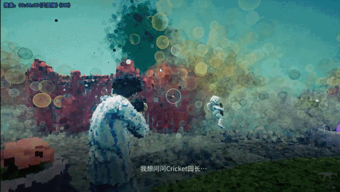 游戏中的场景就像是一幅幅由马赛克堆成的动态抽象画,玩家的角色仅仅是行走在其中,将抽象化的场景变成实体的过程,就有一种色彩流动的美感。在此之上,由制作人Baiyon亲自操刀制作的电子音乐,则为整个场景赋予了一种悬浮与朦胧的感觉。二者的结合,让《异梦物语》看起来反而是更能表达出“梦核”美学的作品,带给玩家的感觉也是如此。