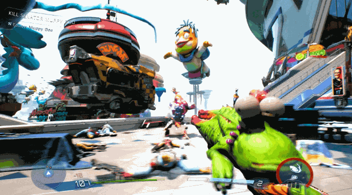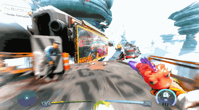 相比于前作,本次试玩中最明显的一点,便是极大加强的角色机动性。除了快跑,玩家还可以踩着滑板在地图上进行移动,速度明显比双腿快了不少。同时,地图上各个地方还有可供滑行的栏杆,以及可供蹬墙跑的大型招牌,各处的钩锁,以及可供弹跳的气球与谜之生物。