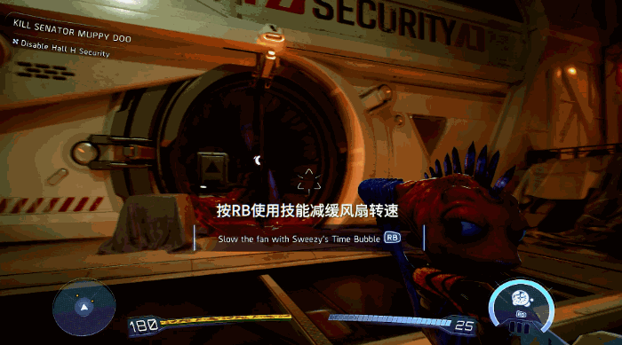 《高能人生2》的战斗系统沿袭前作,每把枪都有自己的独特机制,同时也有自己独属的技能。在本次试玩流程中,我首先玩到了来自前作的“Sweezy”。这把枪的射击机制类似于《光环》里的电磁枪,它是一把连发手枪,同时还可以蓄力射出一发强力子弹。而它的专属技能则是能射出一个能令时间减速的泡泡,从而延缓物体或敌人的行动。