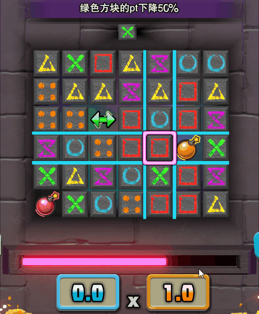 但要说回《夺宝砖家》对此类玩法的创新之处,自然也大有文章可做。游戏的核心机制便在于突破了传统消除“一次只能滑动一格”的限制:滑动消除可以让玩家的操作在“横纵”之间自由切换,随之而来的则是整个盘面如同“魔方”一样联动变化。