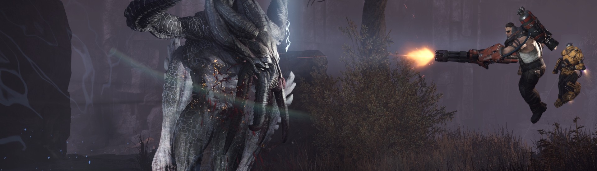 作为一款专注于在线多人合作竞技的作品,《进化(Evolve)》的剧情真的是一点儿也不重要。Turtle Rock工作室也没有在这个方面浪费多少笔墨,总而言之,人类在行星Shear的殖民地遭到了原住民(怪兽)的攻击,而我们那已经习惯了在群星之间横着走的同胞对此的回应就是一支精英猎杀小队。猎杀是《进化》的核心,游戏的形式和精神都凝结在了这种玩法周围,具体来说就是让四个猎手与一头怪物在一片危机四伏的原野/丛林/溪谷间中玩一场猫捉老鼠。Turtle Rock工作室采用了一种乖巧的方式来给作品加入了一点儿超越了传统对抗的内容,那就是通常意义上的Boss也是由人类玩家所扮演,这也是本作最大的特点和噱头。